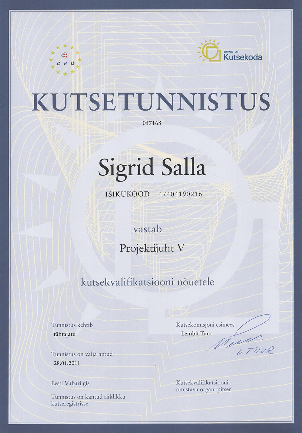 Koolitaja Sigrid Salla on olnud Eestis ka projektijuhtimise kutsestandardi loonud projektimeeskonna liige ning omab tähtajatut projektijuhi kõrgeima kvalifikatsioonitasemega kutsetunnistust. Lisaks on töötanud aastaid ka projektijuhi kutsekomisjoni liikmena.